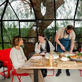 Pongámonos cómodos, nos presentamos con un buen brindis de bienvenida y nos preparamos para la degustación que tendrá lugar en una fantástica invernadero de cristal, coronado por un majestuoso sauce, en la cercana campiña de Ostuni.